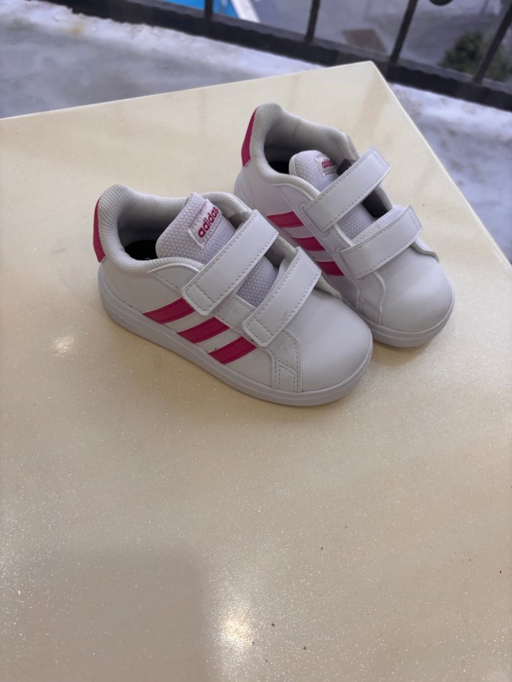 Kız çocukları için pembe bantlı, kaymaz kauçuk tabanlı ve kolay giyilen cırt cırtlı spor ayakkabılar. Sokak tarzına uygun. #çürün sıfır kullanılmadı kutusuyla duruyor #adidas #adidasayakkabı #adidasbebek #bebekspor