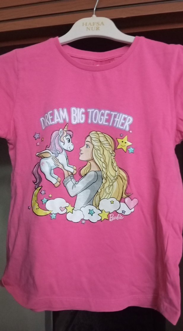 Pembe pamuklu tişört, bol kesim ve yuvarlak yaka. Üzerinde Barbien kız ve tek boynuzlu at baskısı ile "DREAM BIG TOGETHER" yazısı bulunur.