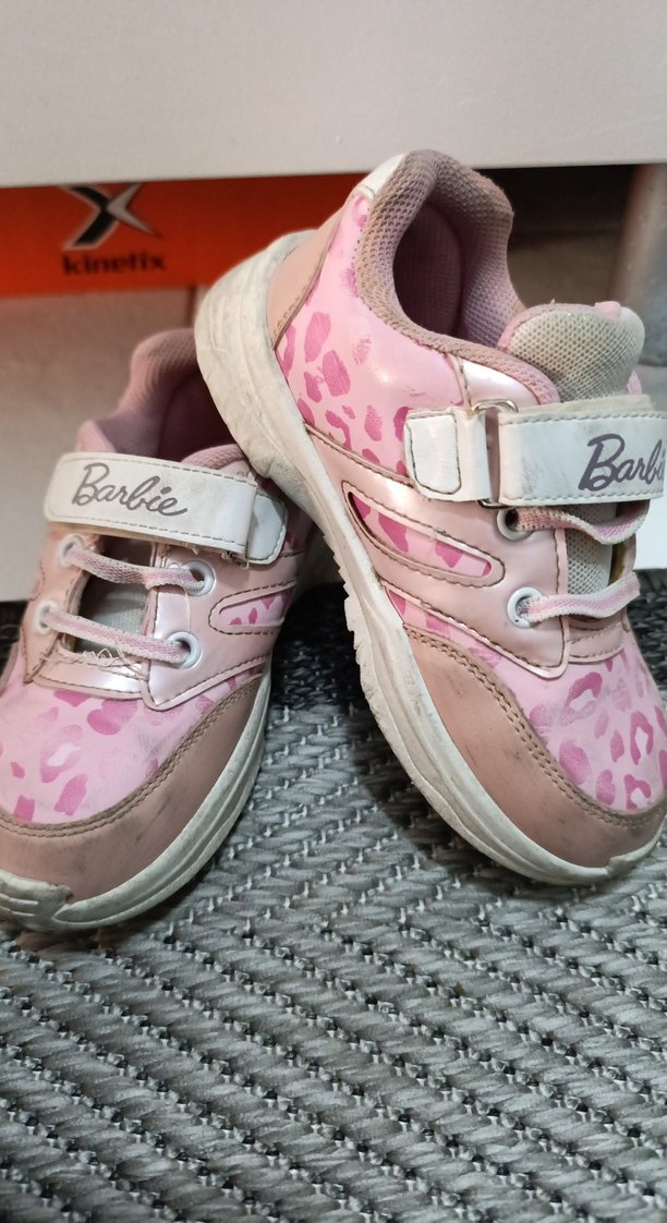 Renkli baskılı desenli, tokalı Barbie markalı pembe kız çocuk spor ayakkabısı. Kauçuk tabanlı, sokak stili için uygun.