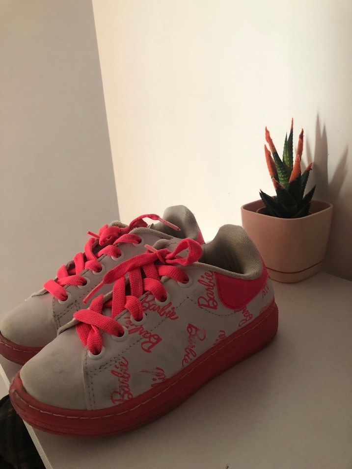 Pembe detaylı, Barbie baskılı kız çocuk spor ayakkabısı, kaymaz taban ve bağcıklı kapanışlar. Resimlerde görüldüğü gibi iyi durumda ayakkabı