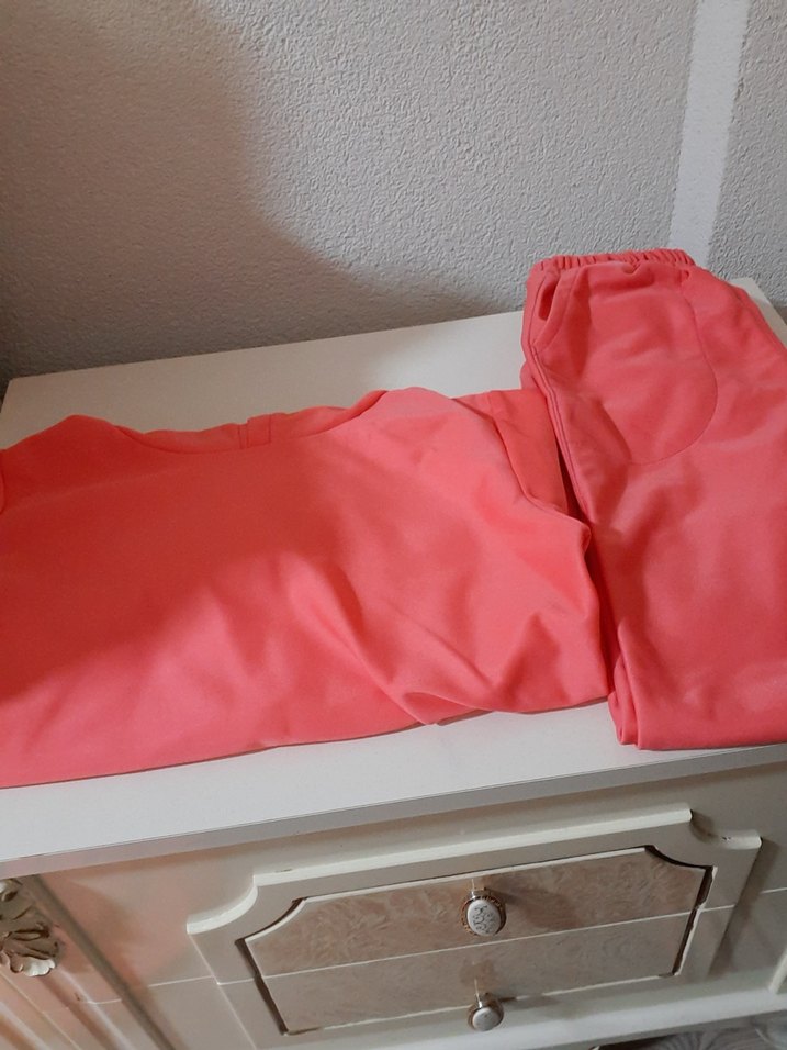 Pembe pastel renkte, kolsuz ve bisiklet yaka üst ile uyumlu pantolondan oluşan, rahat sentetik kumaşlı kız çocuk basic takımı. özel dikim ölçü isteyin 8 9 yaş uyumlu