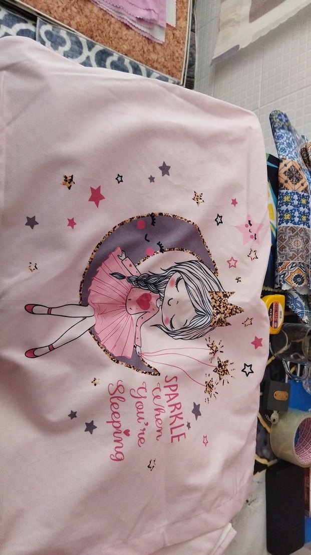 Pastel pembe renkte, askılı ve fermuarlı kız çocuk yastık kılıfı . Üzerinde uyuyan kız ve yıldızlar baskısı, "SPARKLE when You're Sleeping" yazısı bulunur.