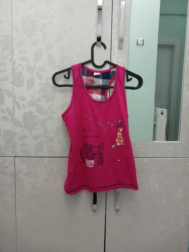 Renkli, pembe askısız kız çocuk atlet, baskılı desenli ve bol kesimdir. Kemer tokası detayıyla sokak modasına uygun.