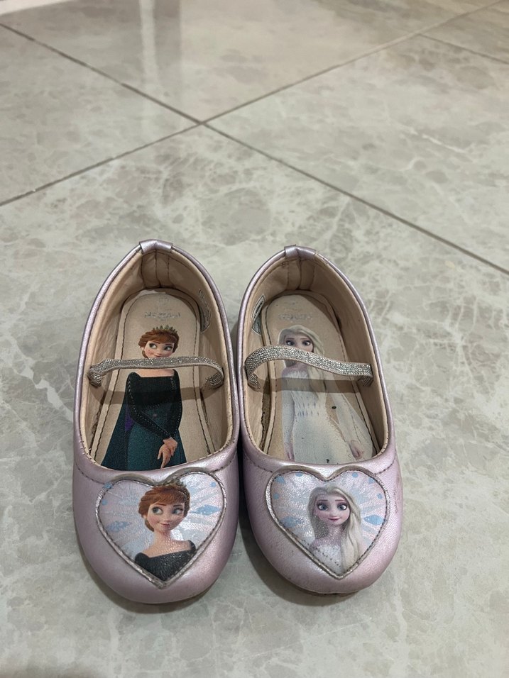 Kız çocukları için pembe tonlarda, baskılı karakter desenli ve tokalı bantlı babet ayakkabı. Esnek kauçuk tabanlıdır.