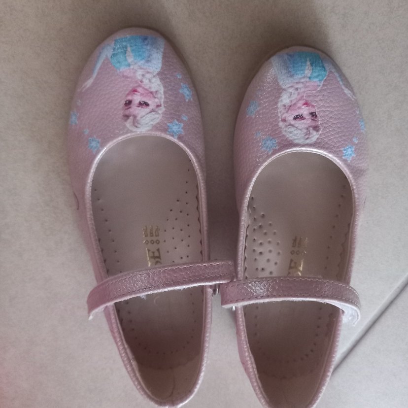 Kız çocukları için pembe baskılı, tokalı bantlı ve kauçuk malzemeden yapılmış babet ayakkabılar. Pastel renk yumuşak bir görünüm sağlar.