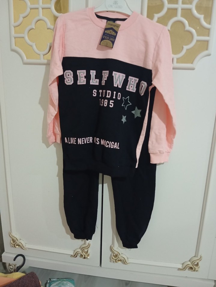 Bol kesim, pembe ve siyah renkli kız çocuk eşofman takımı. Uzun kollu, bisiklet yaka, baskılı ve kemerli. Yumuşak ve sıcak kumaştan üretilmiştir.