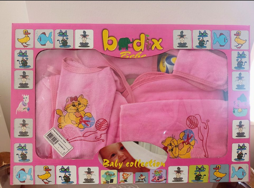 Renkli pembe bornoz ve havlu seti, yumuşak polar kumaş ve eğlenceli baskılar içerir. Birdix Baby Collection ürünüdür. %100pamuk mağaza ürünü dür.