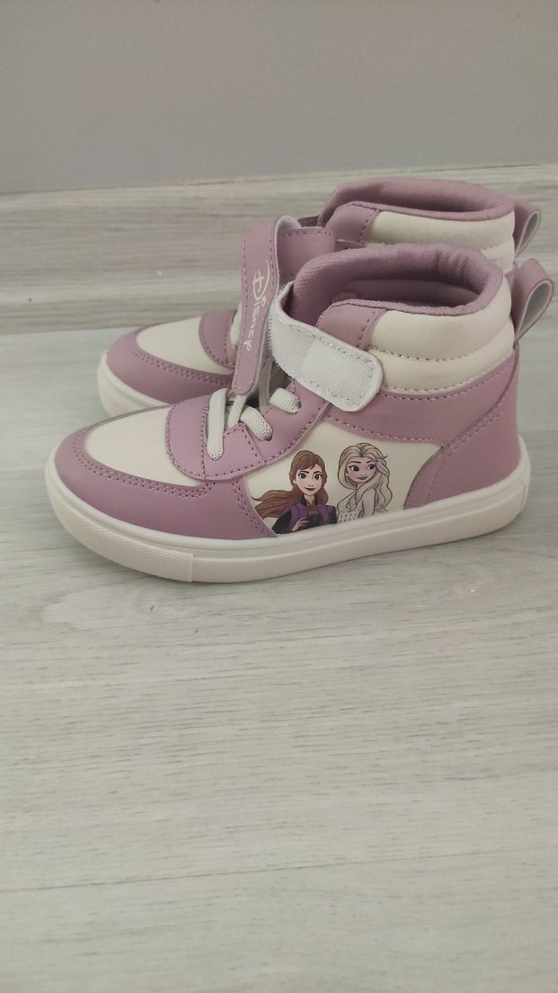 Pembe pastel renkte, baskılı karakter detaylı, cırt cırtlı ve kauçuk tabanlı kız çocuk spor ayakkabısı.