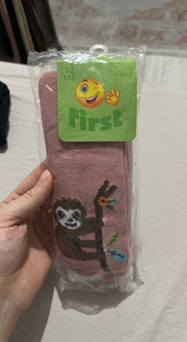 1-2 yaş için pembe, yumuşak ve sıcak kumaştan yapılmış, temalı baskılı kız çocuk çorabı. Marka: First.