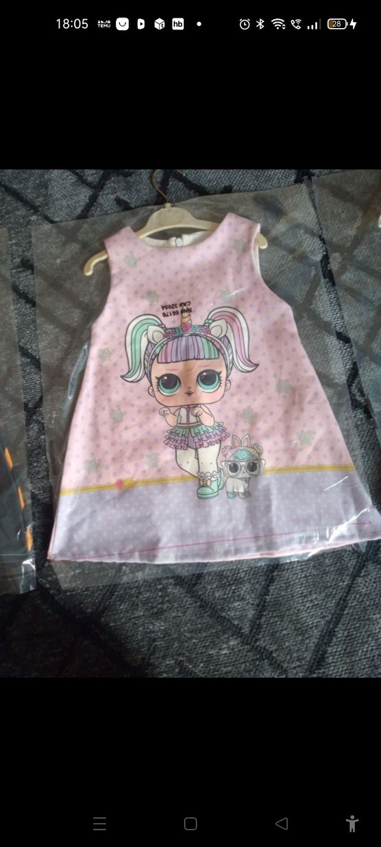 Kolsuz, bol kesim pembe elbise, baskılı çizgi karakter ve dantel detaylı. Yumuşak sentetik kumaştan, yuvarlak yakalı.