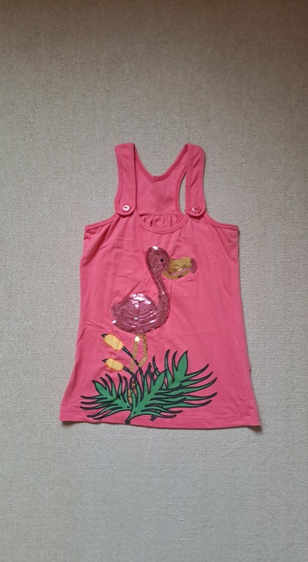 Kız çocuklar için düğmeli, pembe renkli, renkli flamingo baskılı, askısız ve bol kesim atlet. Yumuşak sentetik kumaştan üretilmiştir.