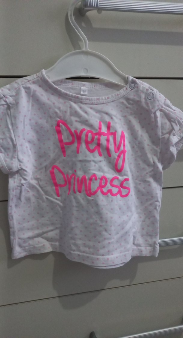 Pamuklu kumaştan yapılmış, kısa kollu, bisiklet yaka, omuzdan düğmeli ve 'Pretty Princess' baskılı pembe kız çocuk tişörtü.