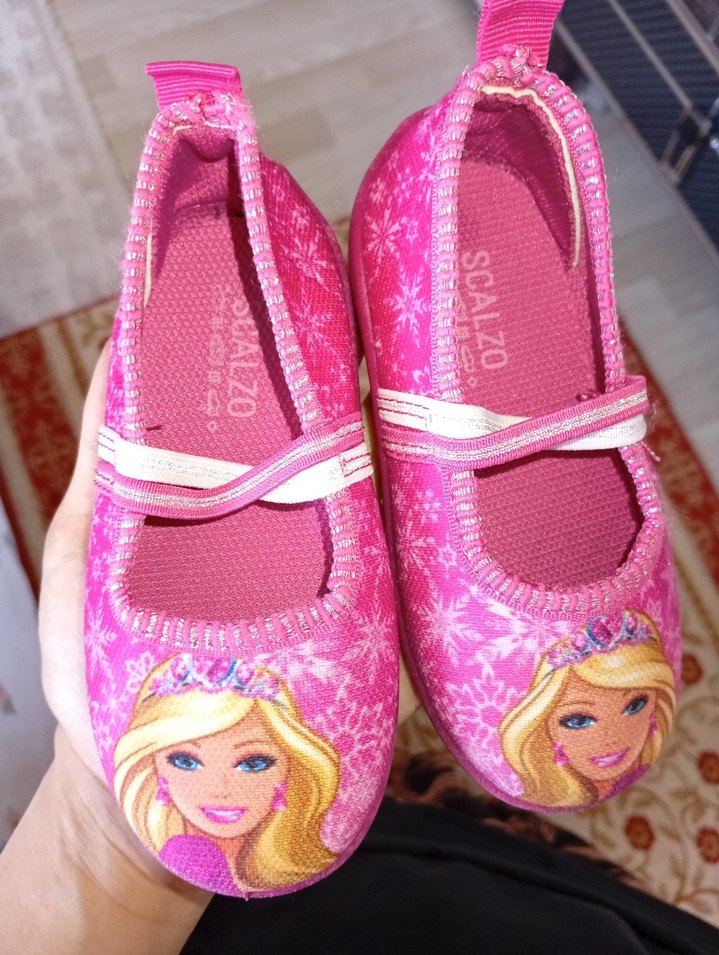 Pembe renkli, baskılı ve elastik bantlı kız çocuk babeti. Esnek giyim için kauçuk malzemeden üretilmiştir. İçinde 'SCALZO' yazısı bulunur.