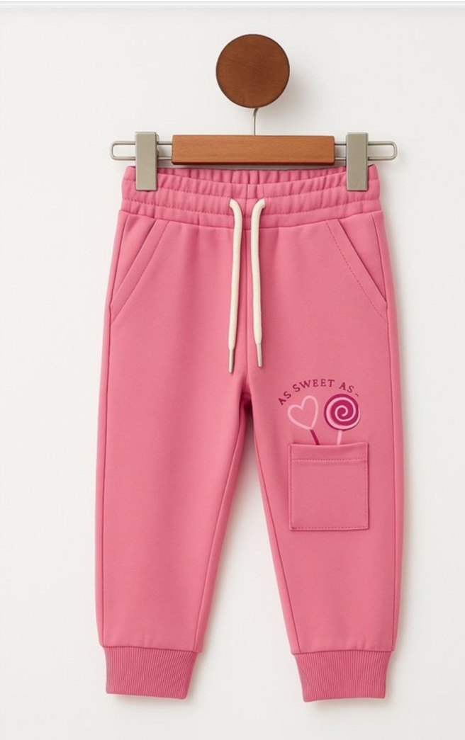 Kız çocukları için pembe renkte, yumuşak kumaştan, bol kesim eşofman altı. Baskılı şeker desenli, cepli ve yapışkanlı detaylıdır 9ay-24 ay mevcuttur. Almadan önce ay belirtiniz. Penye Pantolon Sweet Cepli Pembe Penye Kumaş Bebek ve Çocuk Eşofman Altı.