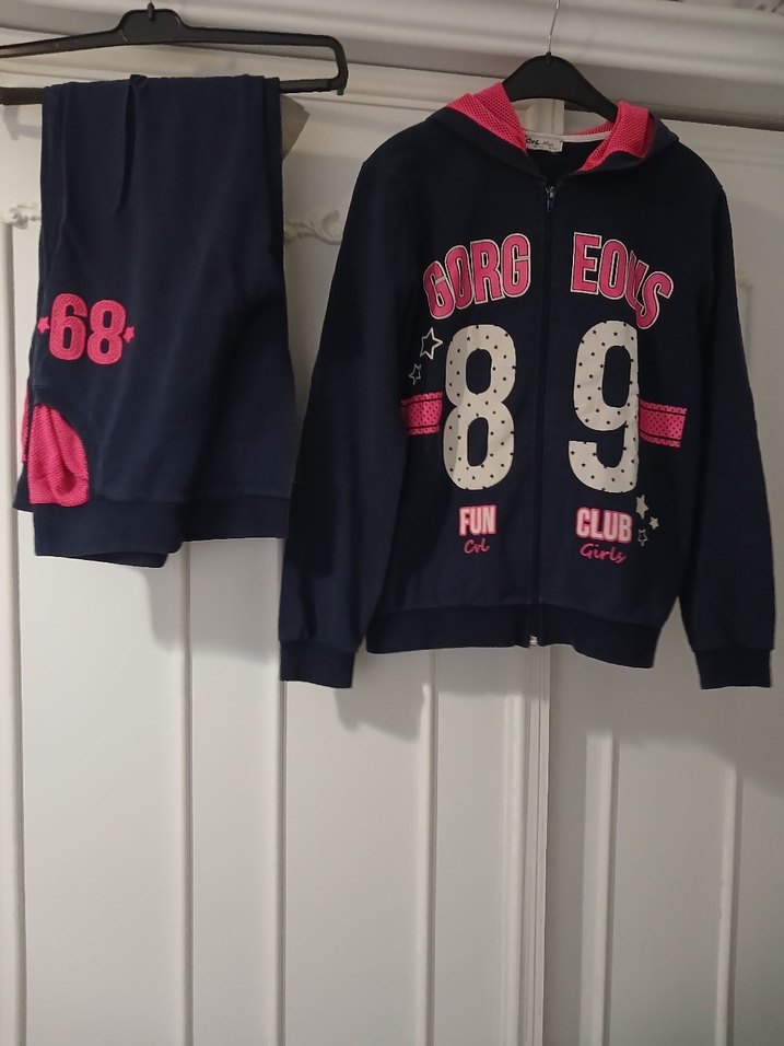 Koyu renkli, pembe baskılı, uzun kollu, kapüşonlu ve fermuarlı kız çocuk eşofman takımı. Elastik bel detaylı, rahat kesimle günlük kullanıma uygun.