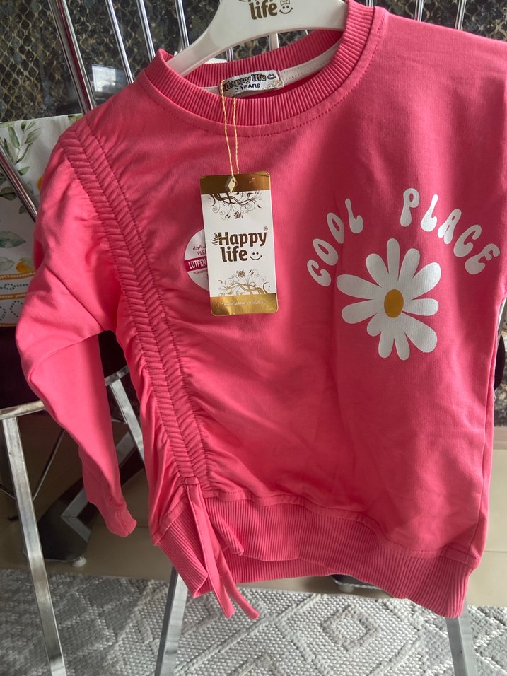Pembe renkli, uzun kollu, yuvarlak yakalı, baskılı ve büzgü detaylı kız çocuk sweatshirtü. Rahat kesimli ve yumuşak, sıcak kumaştan üretilmiştir. yüz pamuk