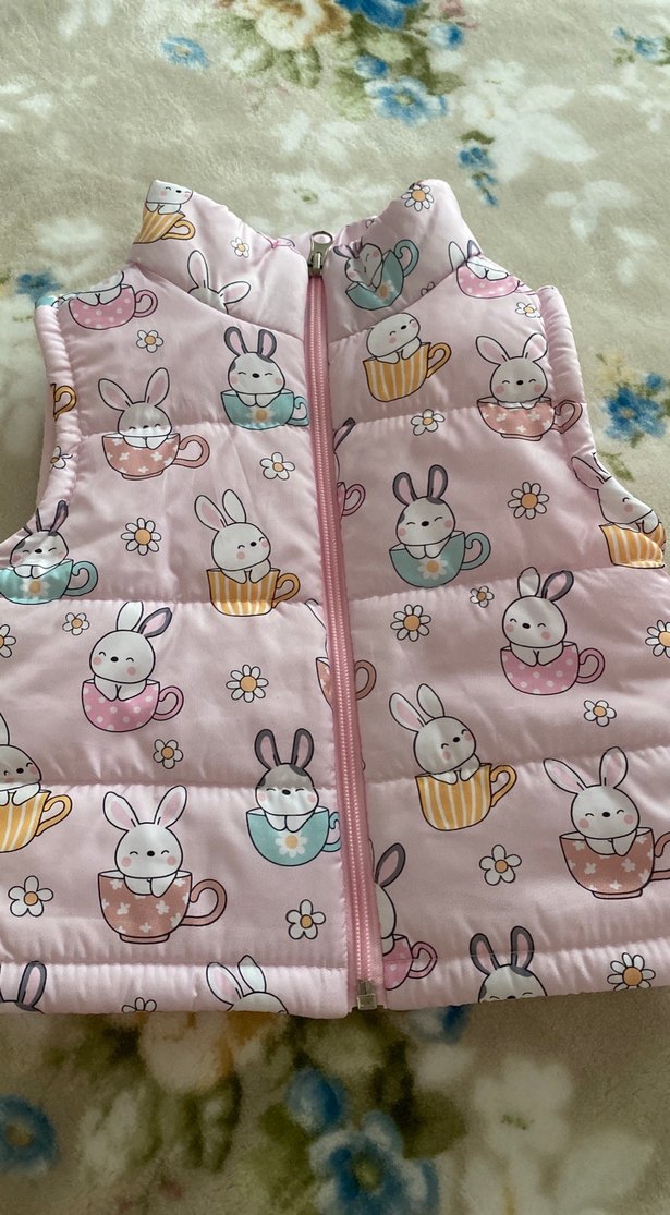 Pembe, baskılı kız çocuk yeleği, fermuarlı ve kolsuz tasarıma sahiptir. Yumuşak sentetik kumaştan yapılmış, pastel renklerde sevimli tavşan desenleri bulunur. 1 yaş sıfır ürün hiç giyilmedi