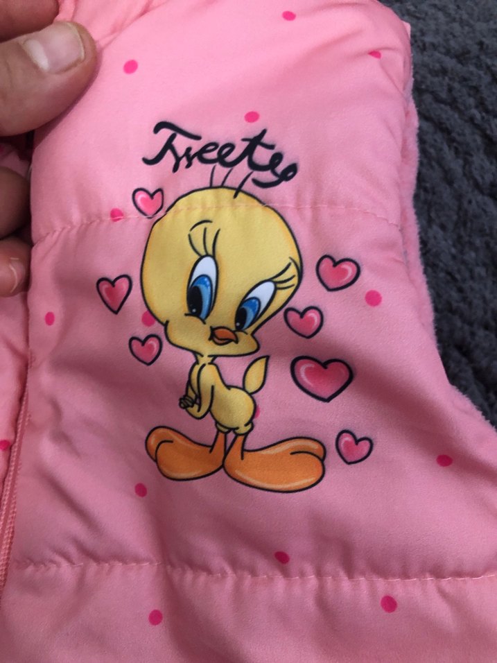 Fermuarlı, baskılı Tweety figürlü, pastel pembe renkli, fitted kesim kız çocuk yeleği. Kolsuz ve bisiklet yaka detaylı, günlük şıklık için uygun.mont#yeni#çok az giyildi yepyeni ve temiz