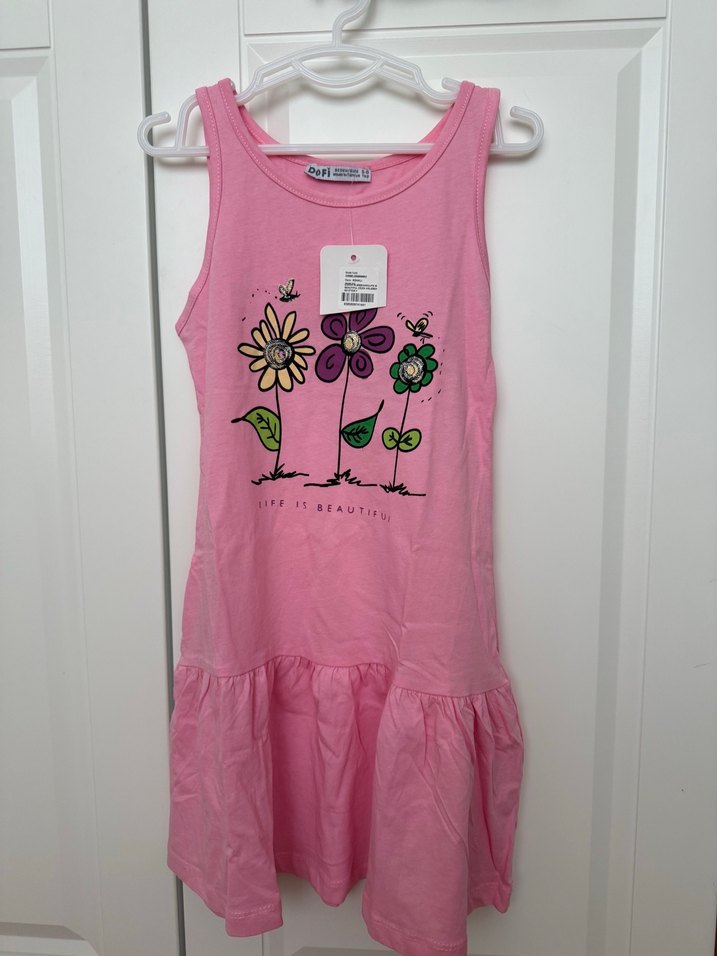 Kolsuz, baskılı çiçek desenli pembe kız çocuk elbisesi. Fırfırlı etek ucu ve rahat kesim, yuvarlak yaka, yumuşak sentetik kumaş, günlük sokak stili için uygun.