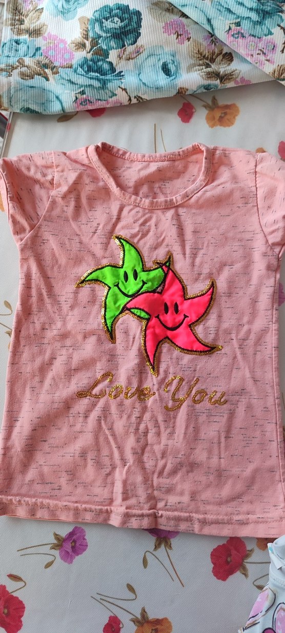Pembe, kısa kollu, bisiklet yaka ve fırfırlı kız çocuk tişörtü. Renkli baskılı gülen yıldızlar ve 'Love You' yazısı bulunur.