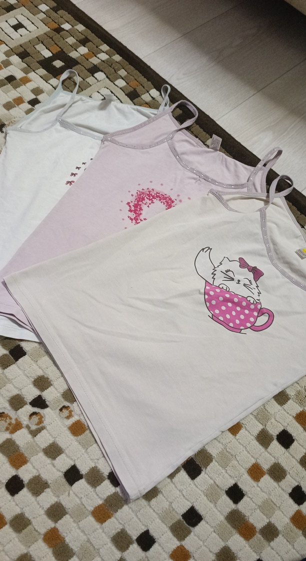 Pastel pembe ve beyaz renklerde, ince askılı kız çocuk atletleri. Kalp ve fincanda kedi gibi baskılı desenler içerir. Yumuşak kumaştan üretilmiştir.