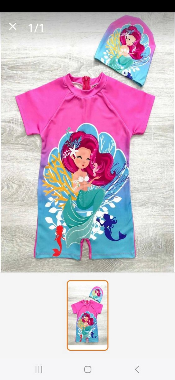 Kısa kollu ve renkli baskılı kız çocuk mayo, plaj için uygun. Üzerinde deniz kızı figürü ve uyumlu şapka bulunur. ♀️
