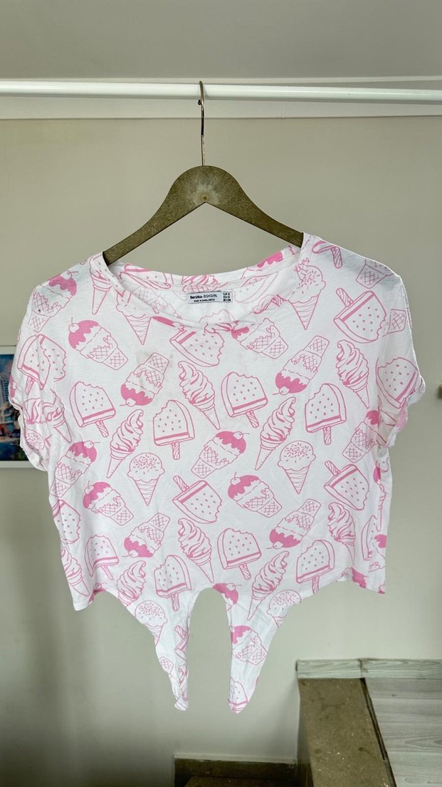 Yumuşak pamuklu, kısa kollu, bisiklet yakalı, bol kesim pembe kız çocuk tişörtü. Üzerinde eğlenceli dondurma baskıları bulunur.