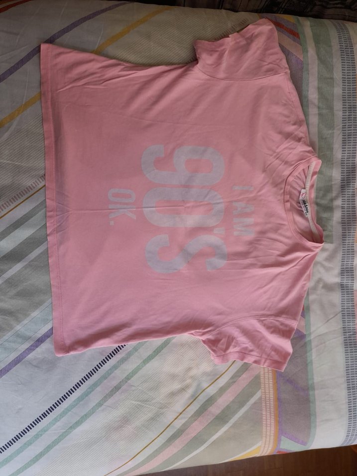 Pembe renkli, bol kesim kız çocuk tişörtü, kısa kollu ve yuvarlak yaka. Pastel tonlarda baskılı, yumuşak sentetik kumaştan yapılmıştır.