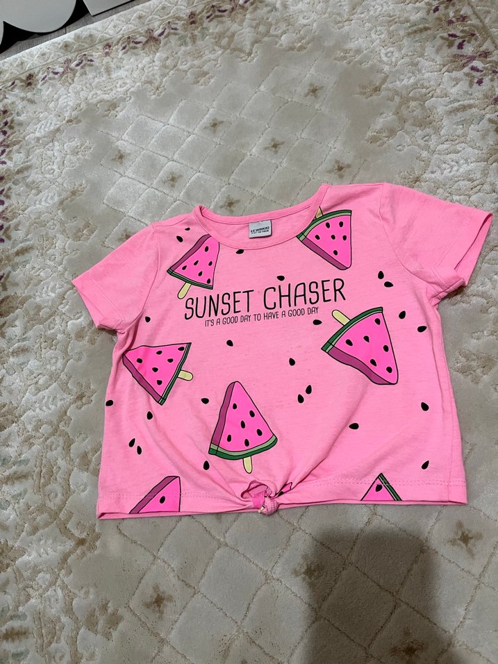 Pamuk kumaştan, kısa kollu ve bol kesim kız çocuk tişörtü. Üzerinde karpuz baskıları ve "SUNSET CHASER" yazısı bulunur.