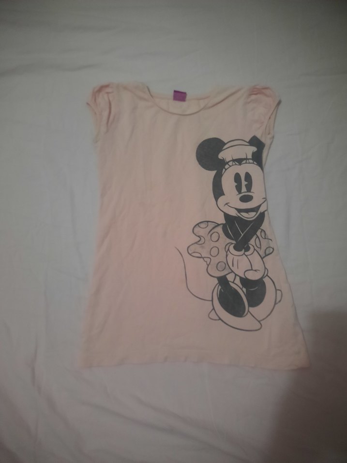 Pamuklu, kısa kollu ve bisiklet yaka kız çocuk tişörtü. Pastel pembe renkte, Minnie Mouse baskılı, rahat ve şık sokak stili için uygundur.