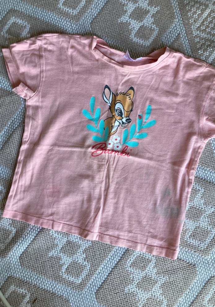 Pamuklu, bol kesim, pembe tişört. Kısa kollu, yuvarlak yakalı, baskılı Bambi figürü ve düğme detaylı.