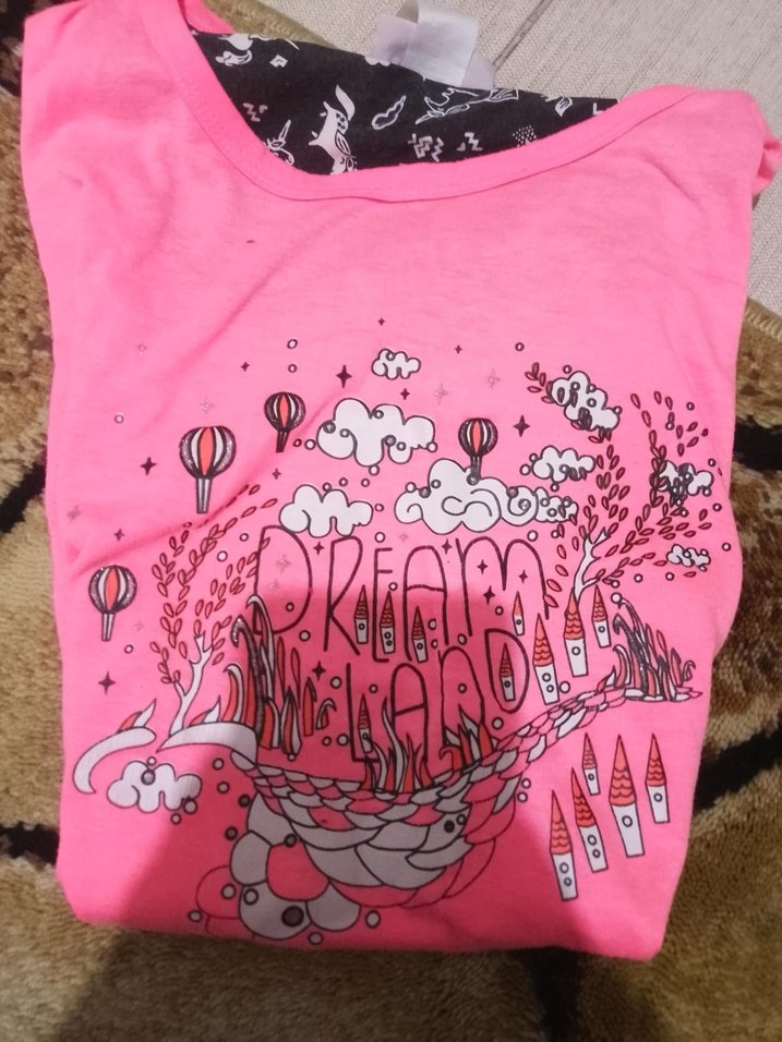 Kız çocukları için pembe renkli, kısa kollu ve yuvarlak yakalı tişört. Sentetik kumaştan, bol kesim ve renkli pop kültür baskılı.