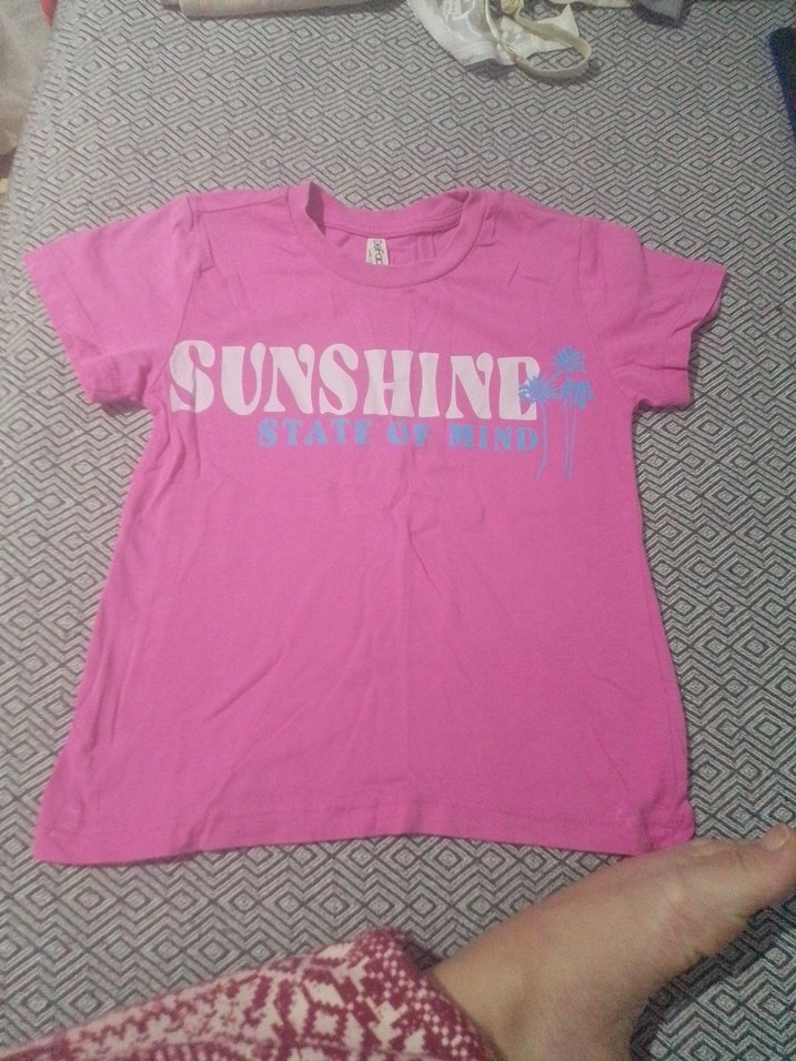 Kız çocukları için kısa kollu, yuvarlak yakalı ve bol kesim pamuklu tişört. Parlak pembe renkte, 'SUNSHINE STATE OF MIND' baskılıdır.
