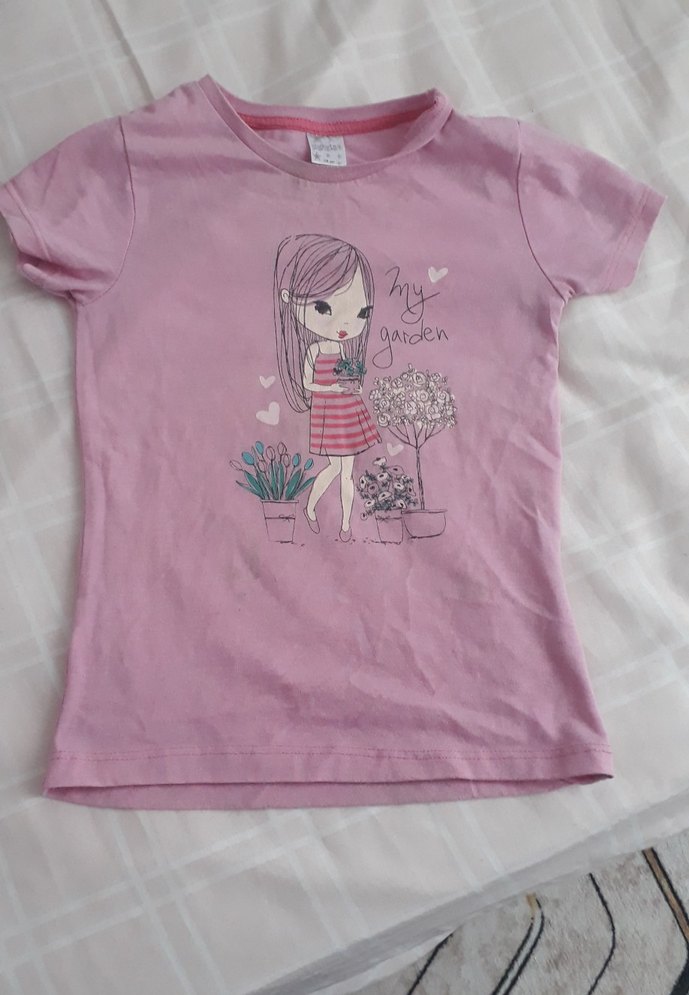 Pamuklu kumaştan yapılmış, kısa kollu, bisiklet yaka ve baskılı desenli pembe renkli kız çocuk tişörtü.