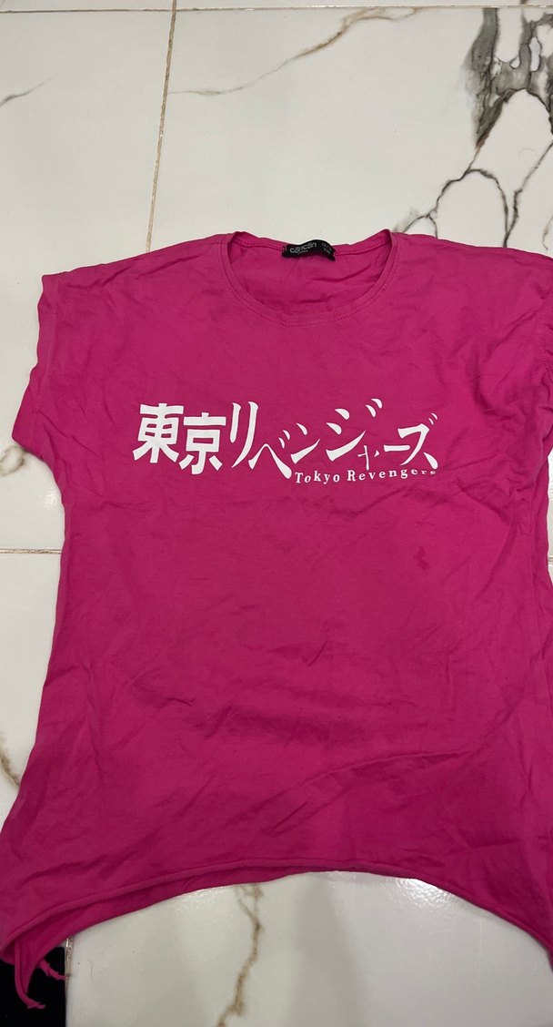 Kız çocuklar için pamuklu, pembe renkli, kısa kollu, yuvarlak yakalı, Tokyo Revengers baskılı bol kesim tişört. Trendy günlük stil için uygundur.