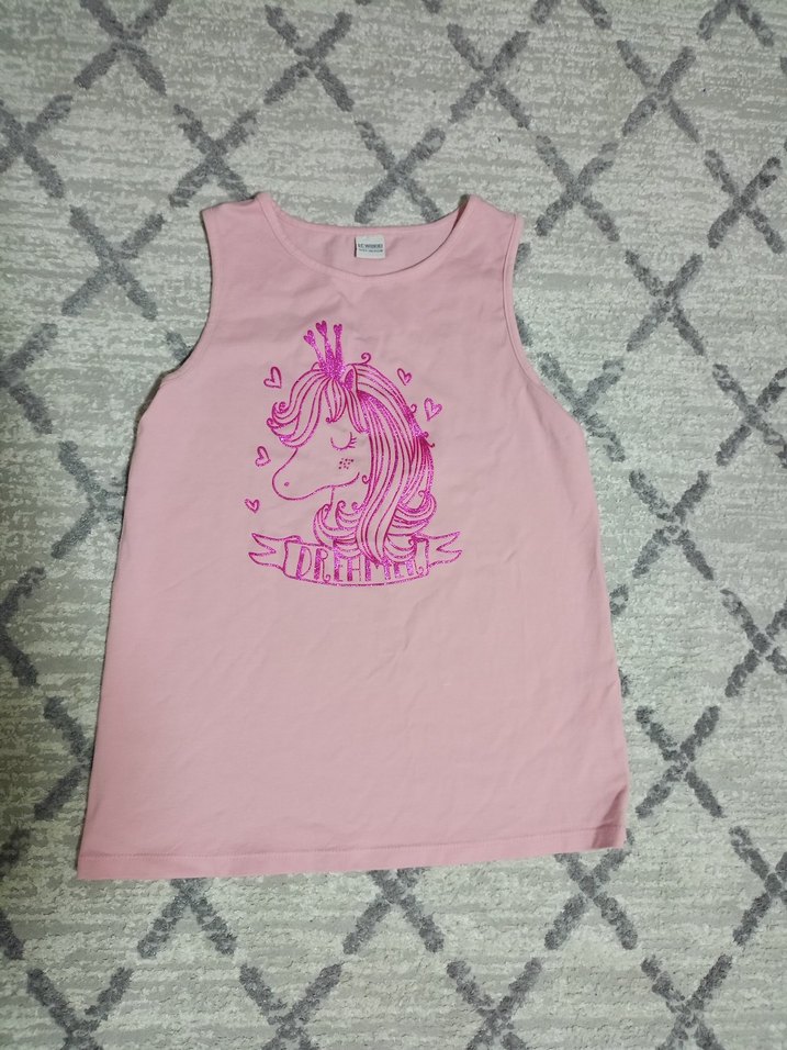 Pastel pembe renkte, kolsuz, yuvarlak yakalı kız çocuk tişörtü. Baskılı tek boynuzlu at motifi ve bol kesimi ile rahat bir stil sunar.