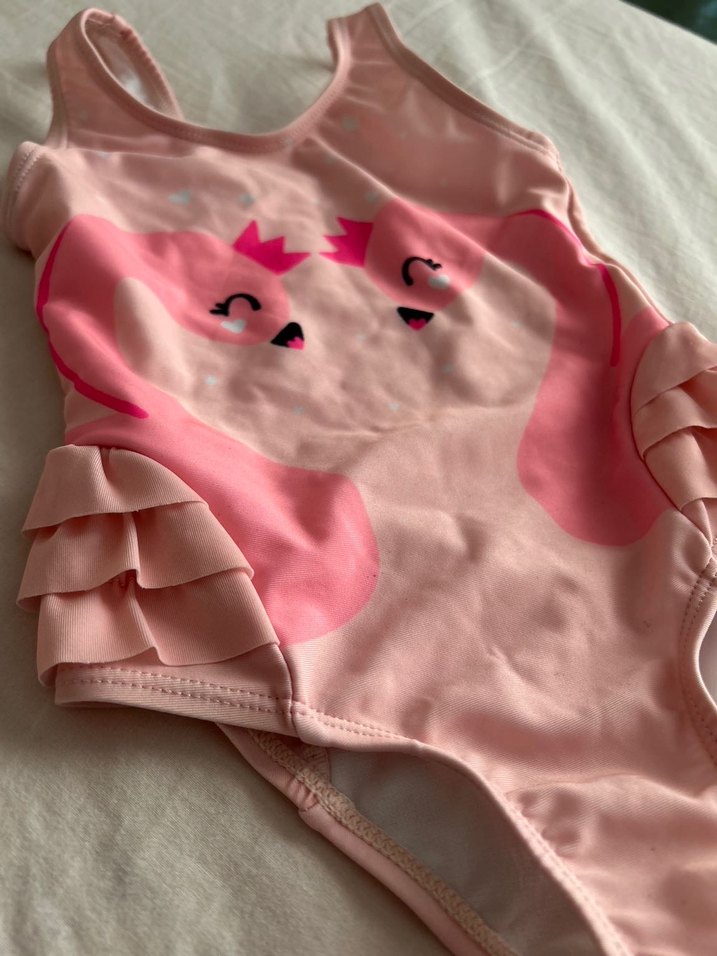 Pembe pastel renkli kız çocuk mayosu, askılı ve baskılı sevimli yüzler içerir. Yanlarda kat kat fırfır detayları bulunur, plaj için uygundur.