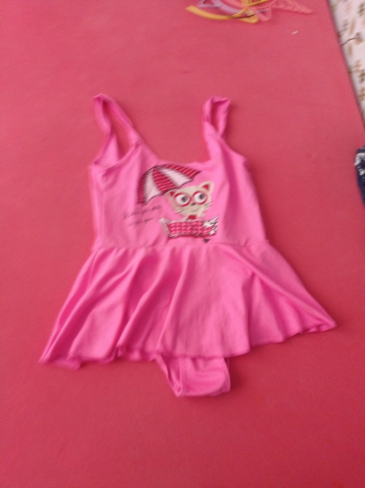 Pembe renkli, baskılı pop kültür desenli, etek detaylı kız çocuk mayo, partiler için uygun.