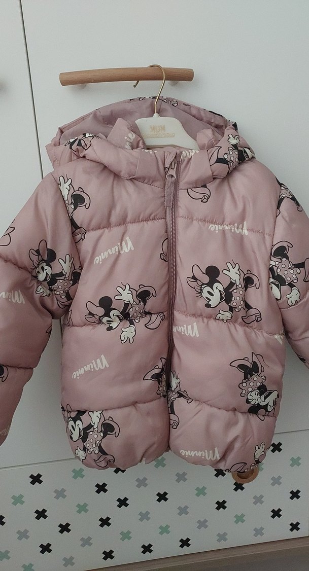 Pembe baskılı Minnie Mouse desenli, kapüşonlu , fitted kesim kız çocuk montu. Streetwear tarzında, yaka tipi kesimli.