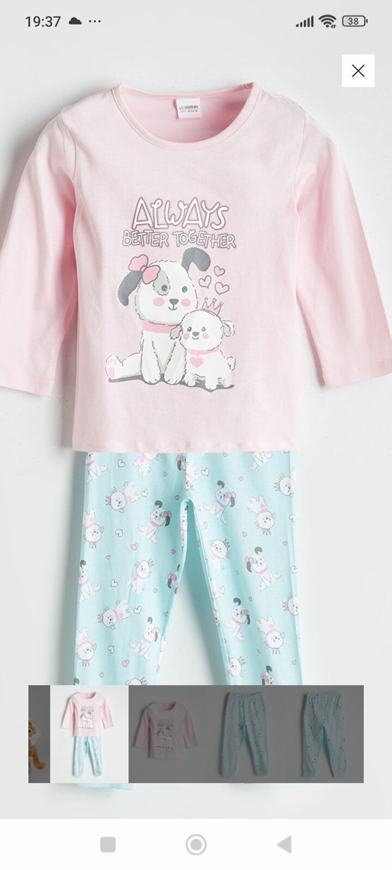 Pastel pembe uzun kollu, baskılı köpek desenli tişört ve açık mavi baskılı pantolondan oluşan pamuklu kız çocuk pijama takımı. Üstte 'ALWAYS BETTER TOGETHER' yazısı bulunur.