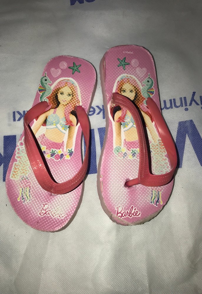 Kız çocukları için renkli baskılı desenlere ve tokalı kayışa sahip pembe plastik terlikler.