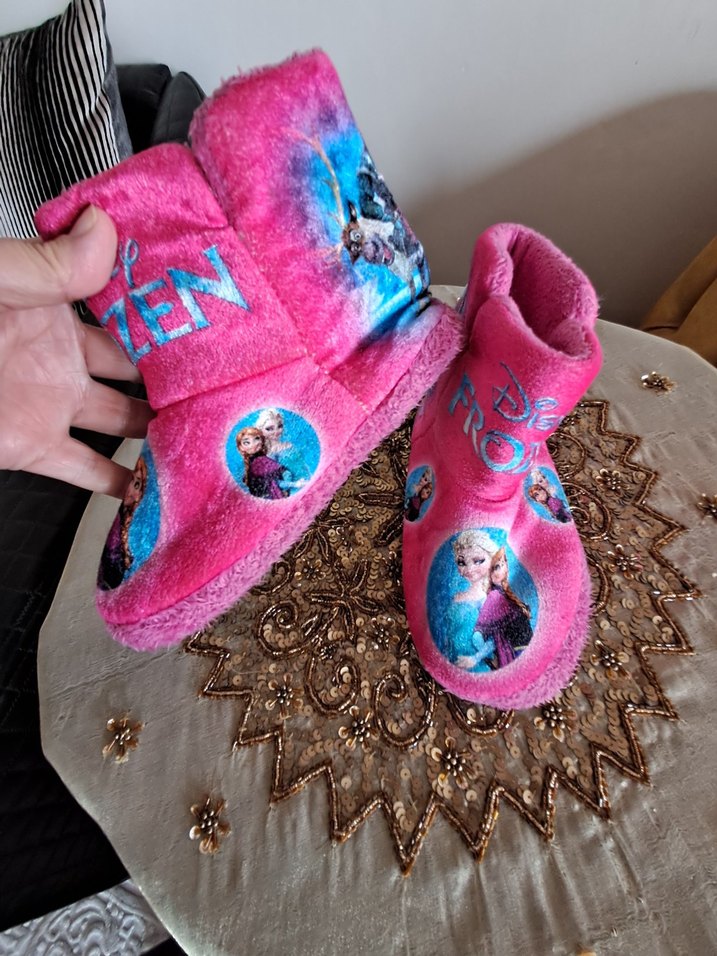 Kız çocukları için renkli baskılı, kürk detaylı, yumuşak ve sıcak kumaştan yapılmış pembe ev terlikleri. Pop kültür tarzına uygun. 31/32 numara