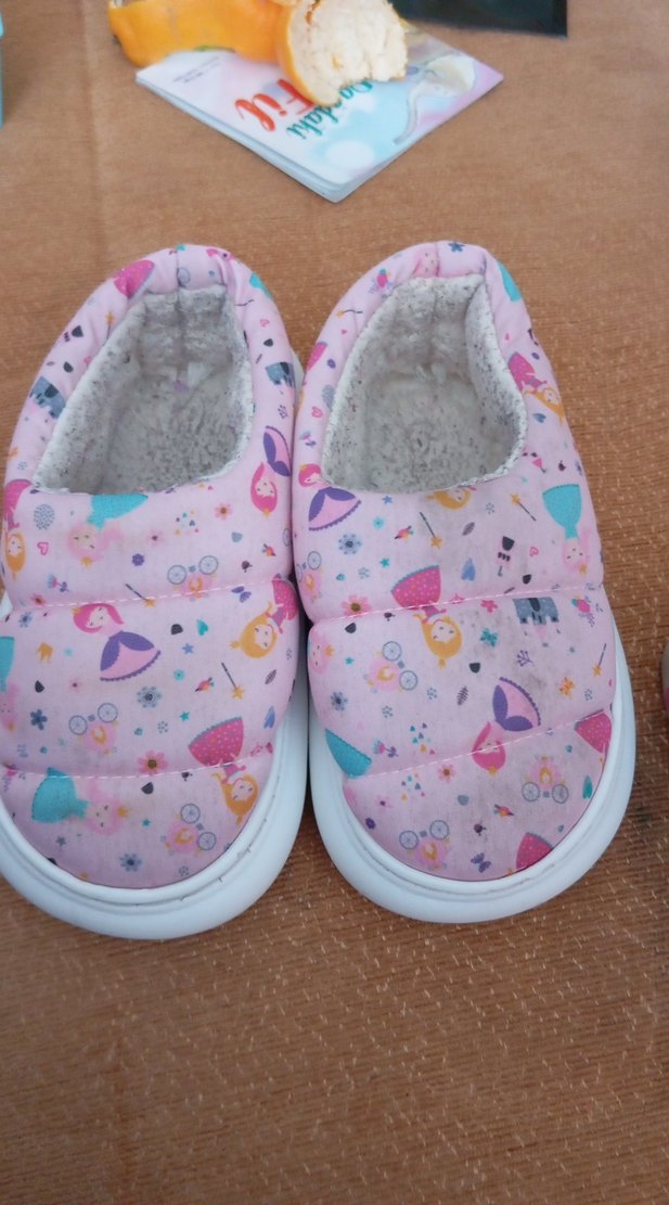 Kız çocukları için pembe, baskılı ve keçe iç astarlı terlikler. Cırt cırtlı kapanışıyla kolay giyilir, sıcak tutar.