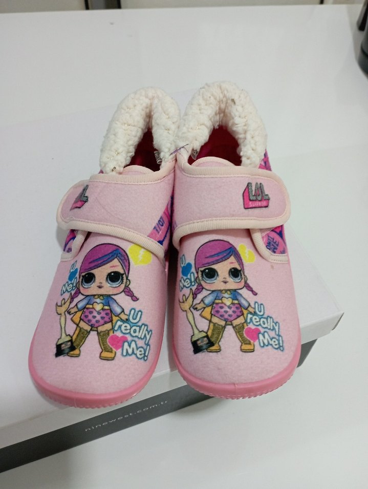 Kız çocuklar için pembe baskılı, keçe kumaştan yapılmış ve kolay kullanım için cırt cırtlı terlikler. Yumuşak ve sıcak, günlük ev kullanımı için uygun.