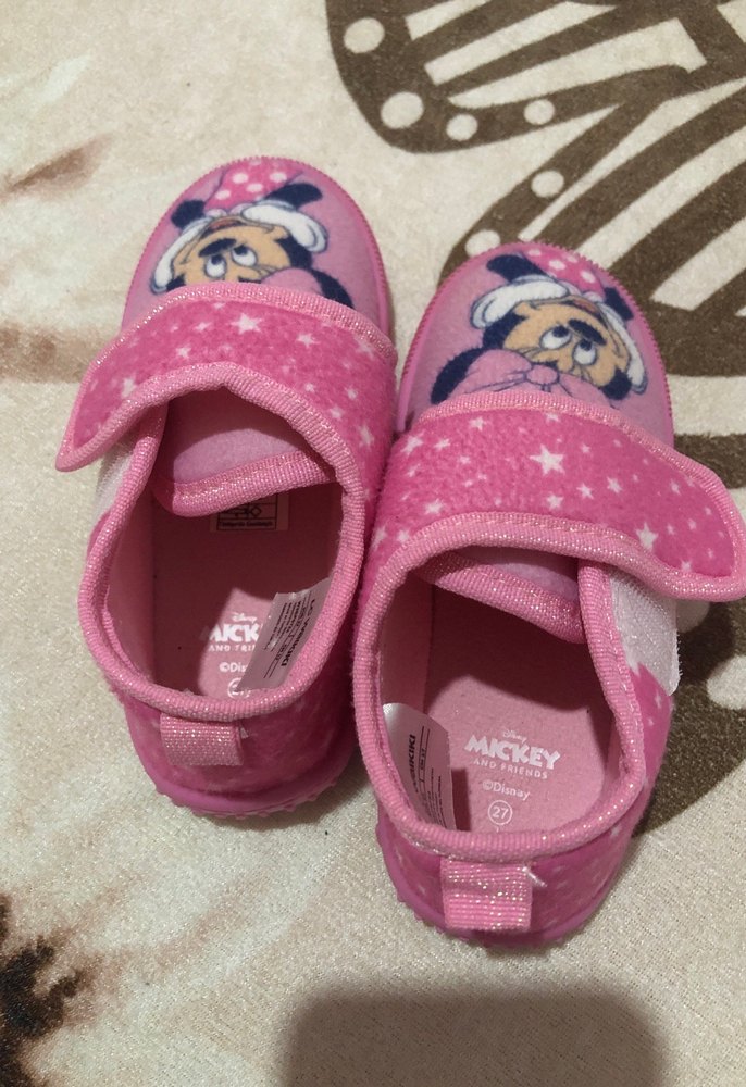 Hıç kullanılmadı Pembe renkli, baskılı ve Velcro bantlı kız çocuk terliği. Yumuşak ve sıcak Bir malzemeden üretilmiş, rahat sokak stili için uygun.