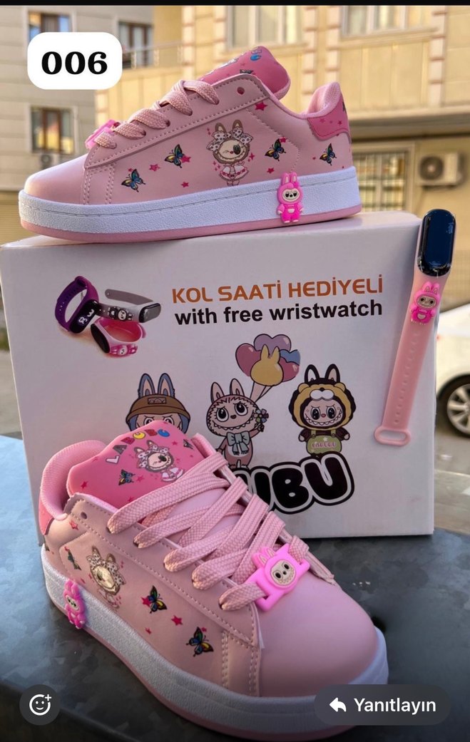 Pembe baskılı kız çocuk spor ayakkabısı, cırt cırtlı ve pastel renkte, yanında ücretsiz kol saati hediyesi ile birlikte.