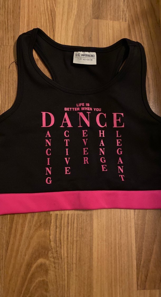 Kız çocukları için dar kesim, kolsuz, yuvarlak yaka sporcu üstü. Dans temalı baskı ve pembe detaylar içerir. Sentetik kumaştan üretilmiştir. Etiketsiz sıfır 7.8 yaş