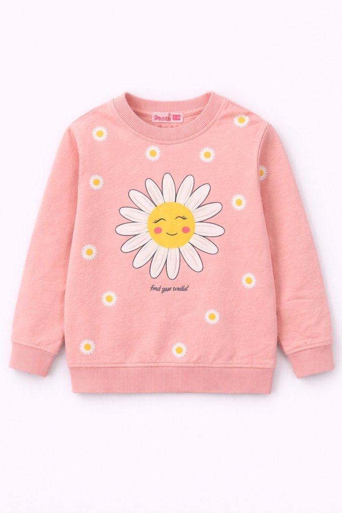 Pembe renkli, uzun kollu, yuvarlak yakalı ve bol kesim kız çocuk sweatshirtü, yumuşak örgü kumaştan yapılmıştır. Renkli papatya baskılı ve gülen güneş deseni içerir.