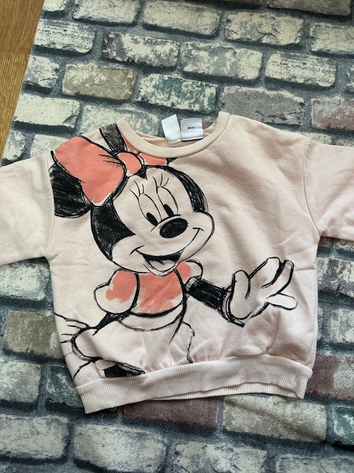 Pamuklu, örgü dokulu pembe sweatshirt, yuvarlak yaka ve uzun kolludur. Baskılı Minnie Mouse deseniyle trend sokak stiline uygundur.