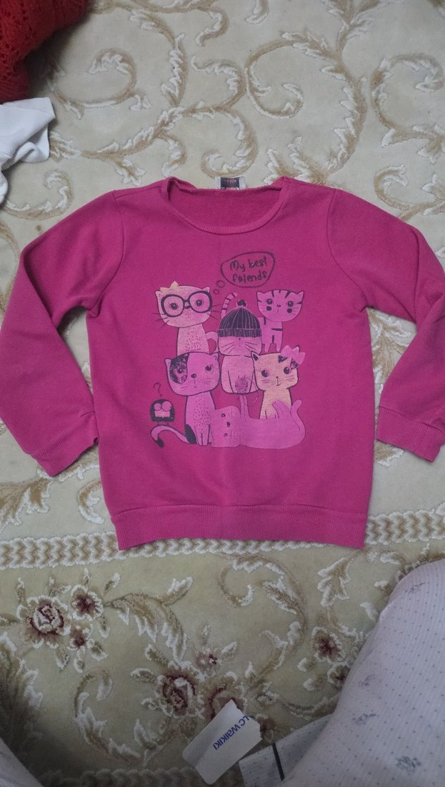 Pembe renkli kız çocuk sweatshirtü, uzun kollu ve bisiklet yaka, yumuşak kumaştan üretilmiş. Renkli örgü baskılı kedilerle süslenmiş, rahat kesimle sokak stili için uygundur.